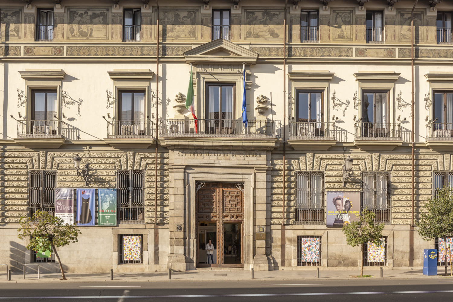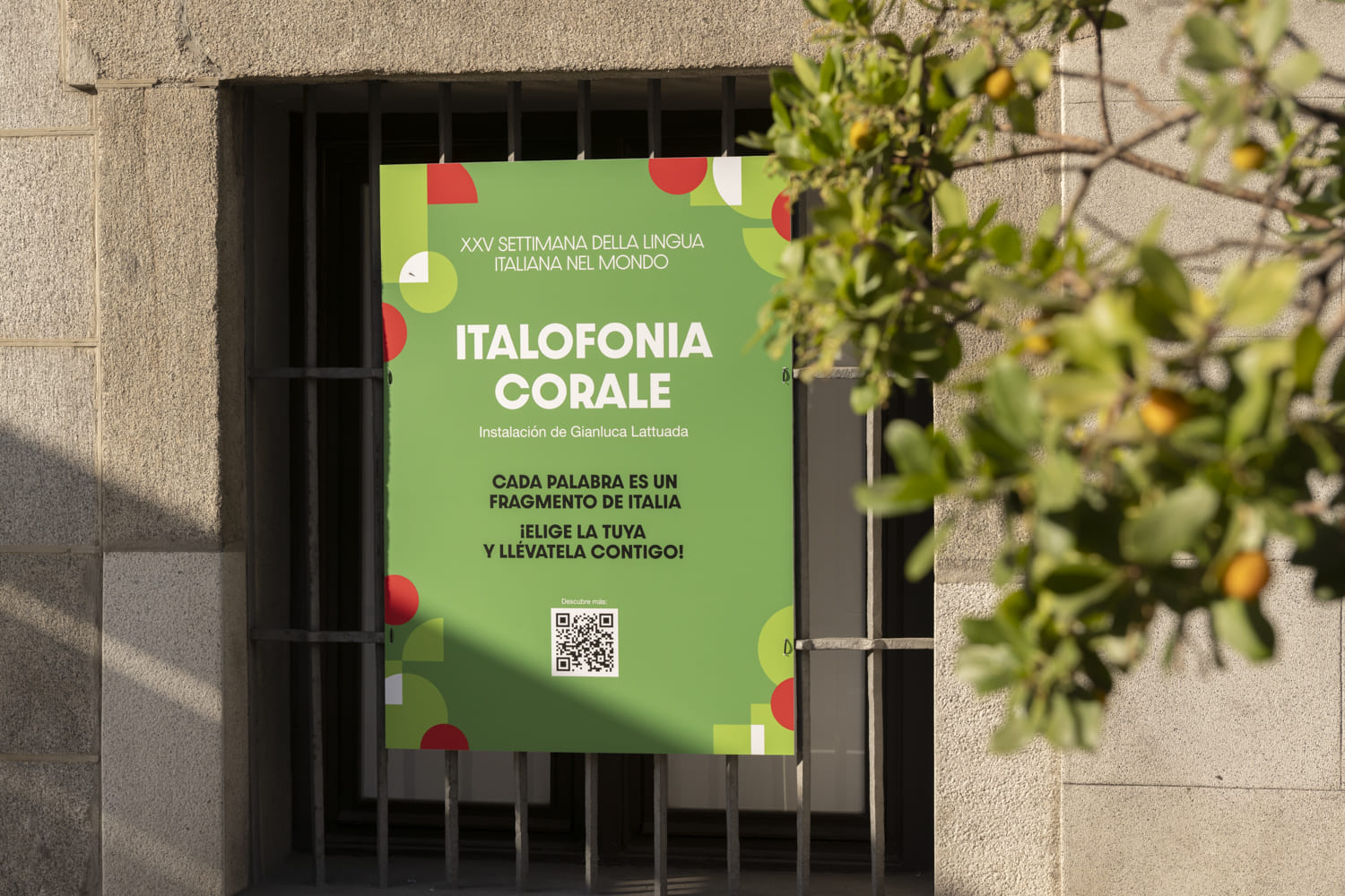ITALOFONIA – CORALE è un’installazione di Gianluca Lattuada che trasforma l’Istituto Italiano di Cultura di Madrid in un organismo vivo, aperto alla città e in dialogo costante con chi la attraversa. In concomitanza della XXV Settimana della lingua italiana nel mondo, l’edificio diventa una voce collettiva: un luogo di incontro tra arte, lingua e comunità.