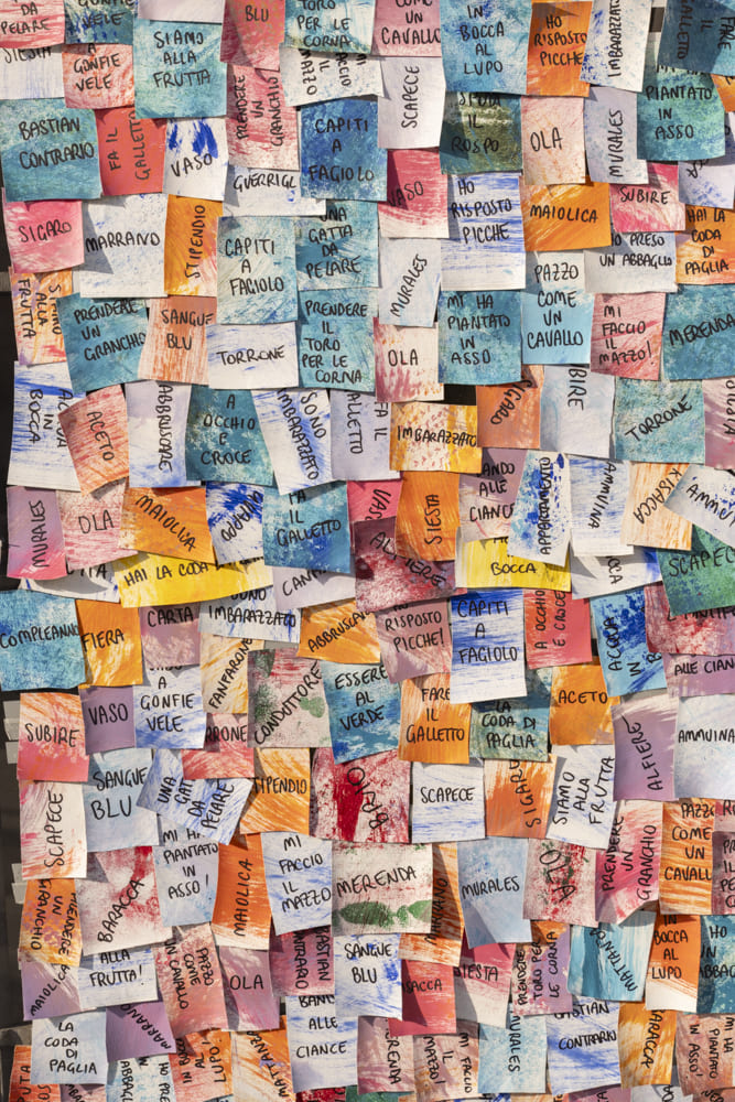 L’opera nasce da grandi tele originali che l’artista ha frammentato in elementi unici, completati a mano con parole simboliche legate alla lingua e alla cultura italiana. Ogni frammento è un piccolo originale, un segno di memoria e di appartenenza: insieme formano un grande mosaico di voci e colori che richiama i muri votivi della tradizione italiana — luoghi di gratitudine e devozione collettiva.